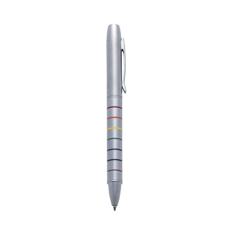 Caneta metal prata com detalhes coloridos. Caneta metal prata com detalhes coloridos.