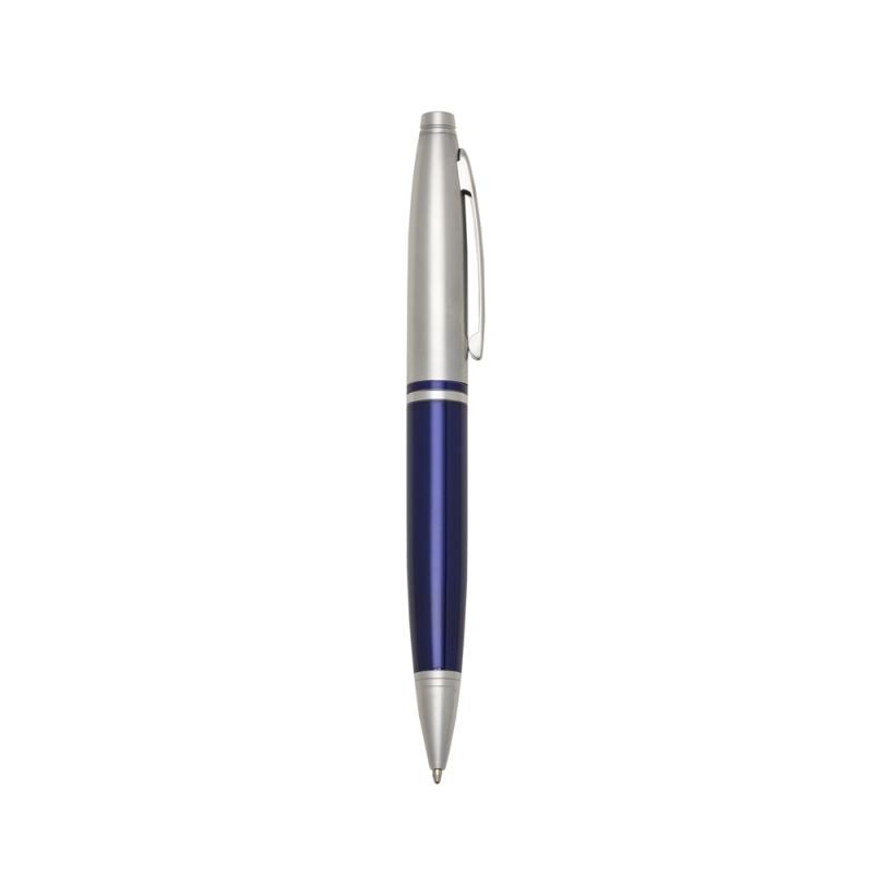 Caneta metal prata com detalhes coloridos.
