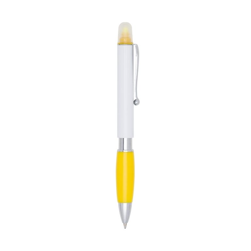 Caneta plástica marca texto com corpo branco e detalhes coloridos