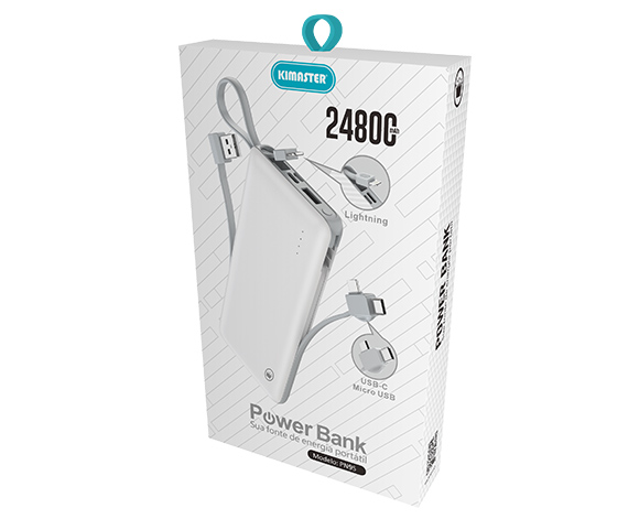 O Carregador Portátil PN959X KIMASTER tem um design robusto. O uso do acessório é bastante intuitivo, bastando apenas conecta-lo ao aparelho que se deseja carregar, o Power Bank já mostrará a carga restante com suas luzes LED azul, ao desconectar o acessório desliga após alguns poucos segundos. O PN959X vem com um cabo Lightning acoplado e um cabo removível Type-C/Micro USB/USB. Não há problemas incompatibilidade de Software, podendo ser utilizado com qualquer versão de um aparelho IOS, ANDROID ou WINDOWS PHONE.