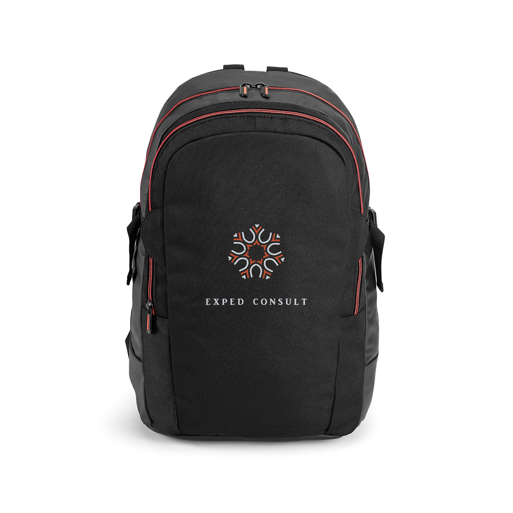 Mochila para notebook. 900D e c. sintético. Com 2 compartimentos. Compartimento posterior forrado, com divisória almofadada para notebook até 17'' e bolso em tela, com zíper. Compartimento frontal forrado, com diversos bolsos interiores. Parte posterior e alças almofadadas.