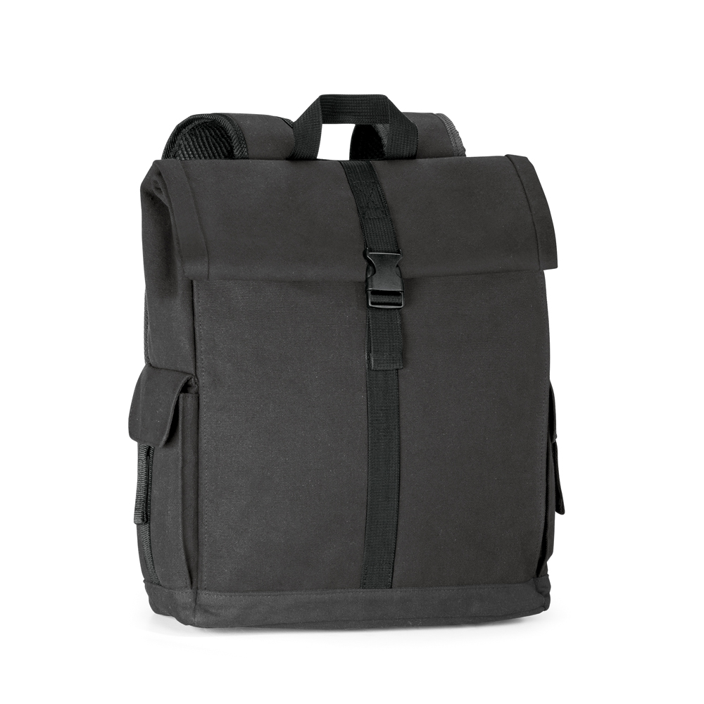 Mochila para notebook. Algodão canvas pré-lavado. Compartimento principal forrado, com 2 bolsos interiores e divisória almofadada para notebook até 15.6". Bolso frontal e 2 bolsos laterais. Parte posterior e alças almofadadas. 300 x 390 x 120 mm