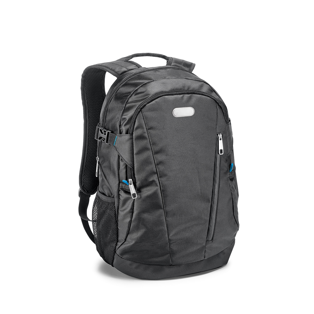 Mochila para notebook. 840D jacquard. Com 2 compartimentos. Compartimento posterior forrado, com divisória almofadada para notebook até 15.6''. Compartimento frontal forrado, com diversos bolsos interiores. Bolso lateral em tela e bolso frontal. Parte posterior almofadada, com sistema de apoio acolchoado para as costas e alças almofadadas. Placa metálica removível com imã, para fácil gravação. 305 x 470 x 180 mm | Placa: 50 x 20 mm