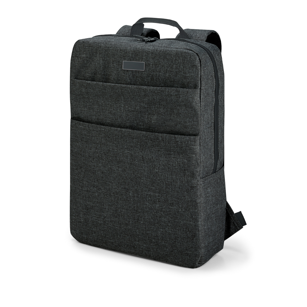 Mochila para notebook. 600D de alta densidade. Compartimento com divisória almofadada para notebook até 15.6''. Interior forrado e almofadado. Com 2 bolsos frontais. Parte posterior e alças almofadadas. Placa metálica removível com imã, para fácil gravação. 295 x 390 x 100 mm | Placa: 50 x 20 mm