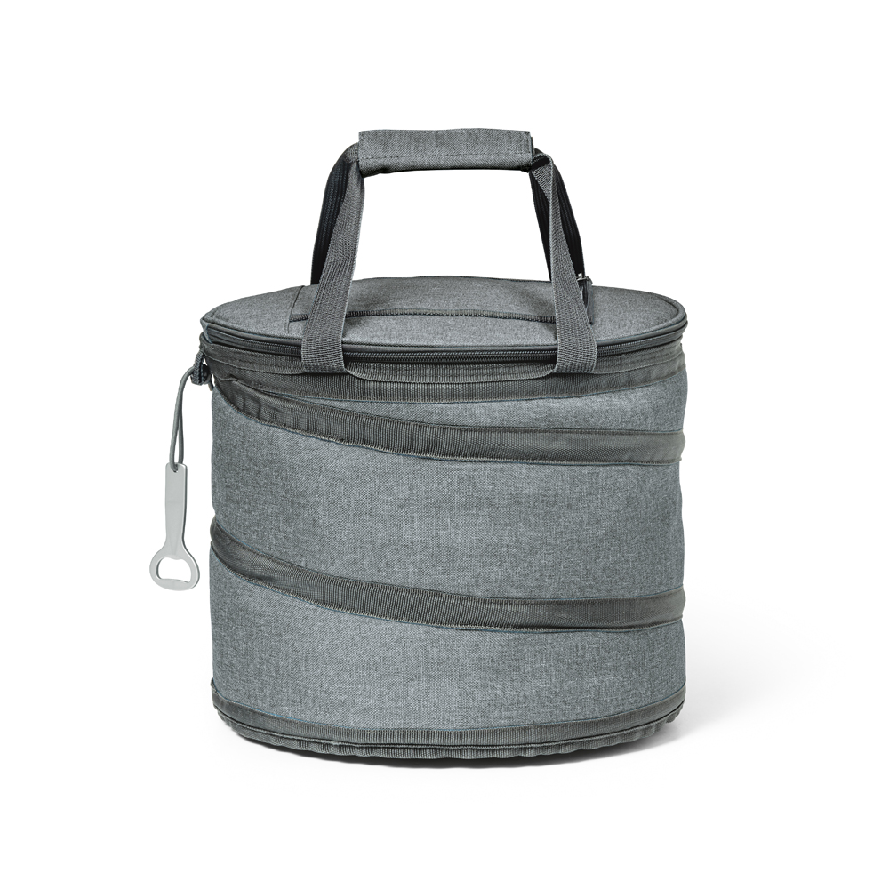 Sacola térmica flexível. 600D. Com zíper duplo, interior forrado com PEVA e abridor de garrafas. Bolso superior com zíper. Alças em webbing, com reforço. Capacidade até 15 L. Food grade. ø300 x 260 mm