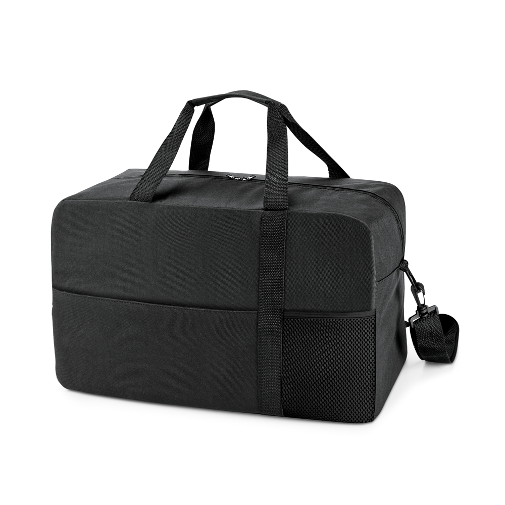 Bolsa esportiva. 600D. Fundo com placa semi-rígida. Bolso frontal com fecho e bolso em tela. Alça de ombro ajustável, com reforço. Squeeze não incluso. 460 x 290 x 220 mm