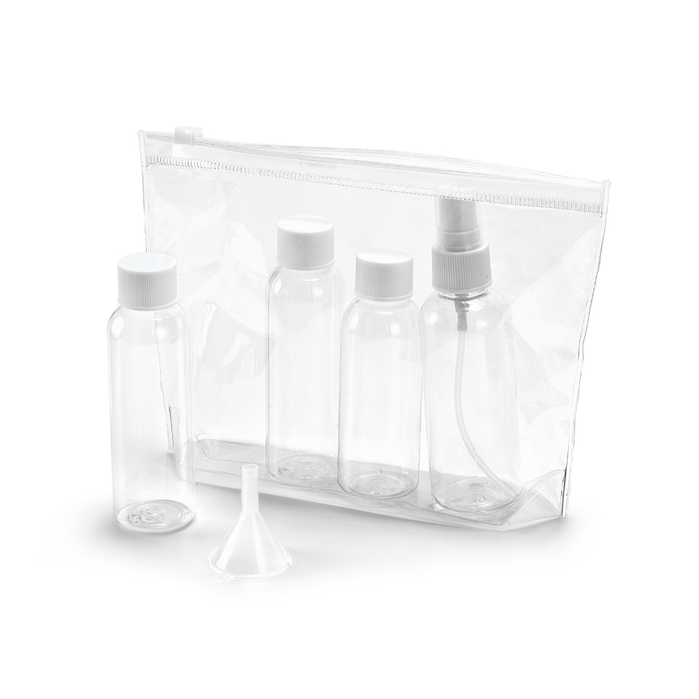 Bolsa de cosméticos hermética. PVC. Incluso 3 frascos (2 x 65 ml e 60 ml), 1 vaporizador (80 ml) e 1 funil. Apropriada para transporte em cabine de avião. 190 x 155 x 40 mm