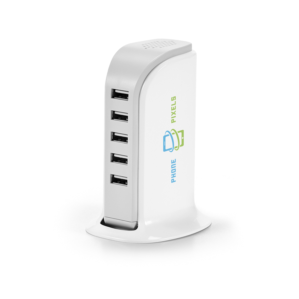 Estação de carregamento USB. ABS. Com 5 saídas 5V/4A. 65 x 110 x 80 mm