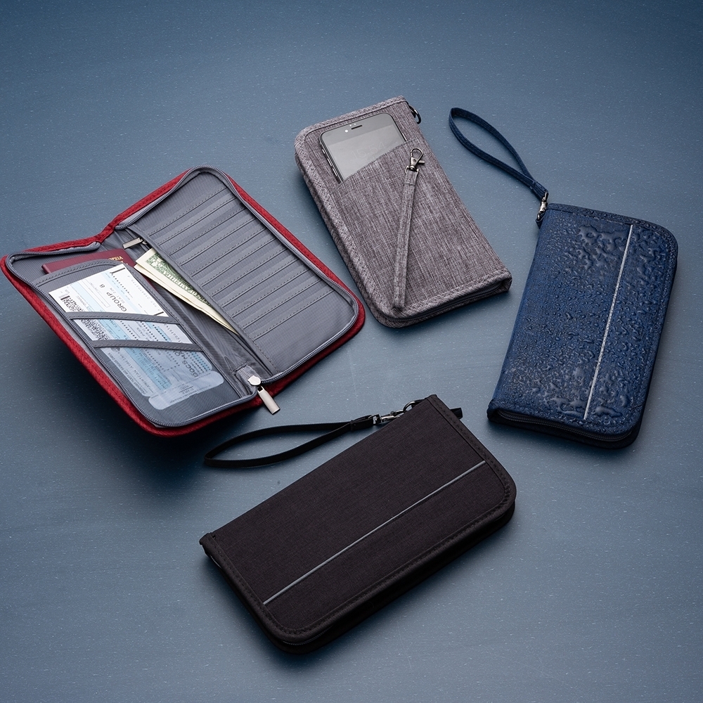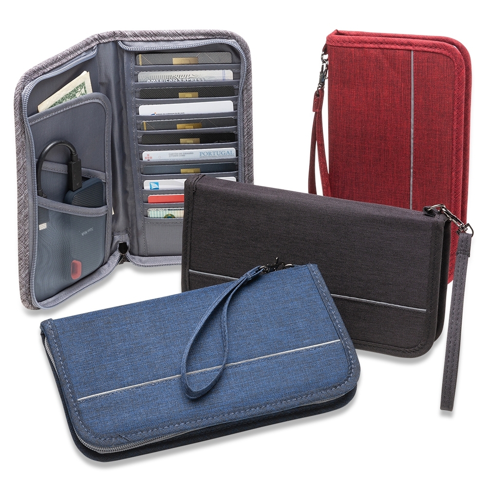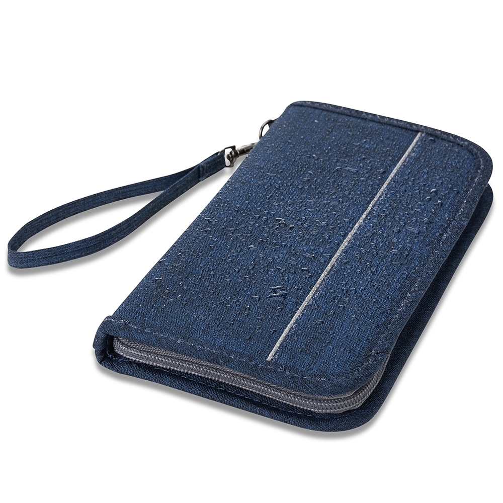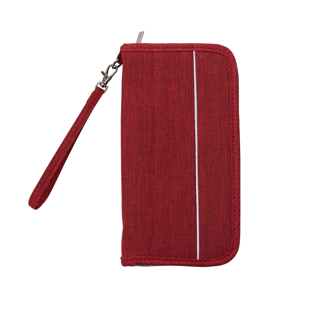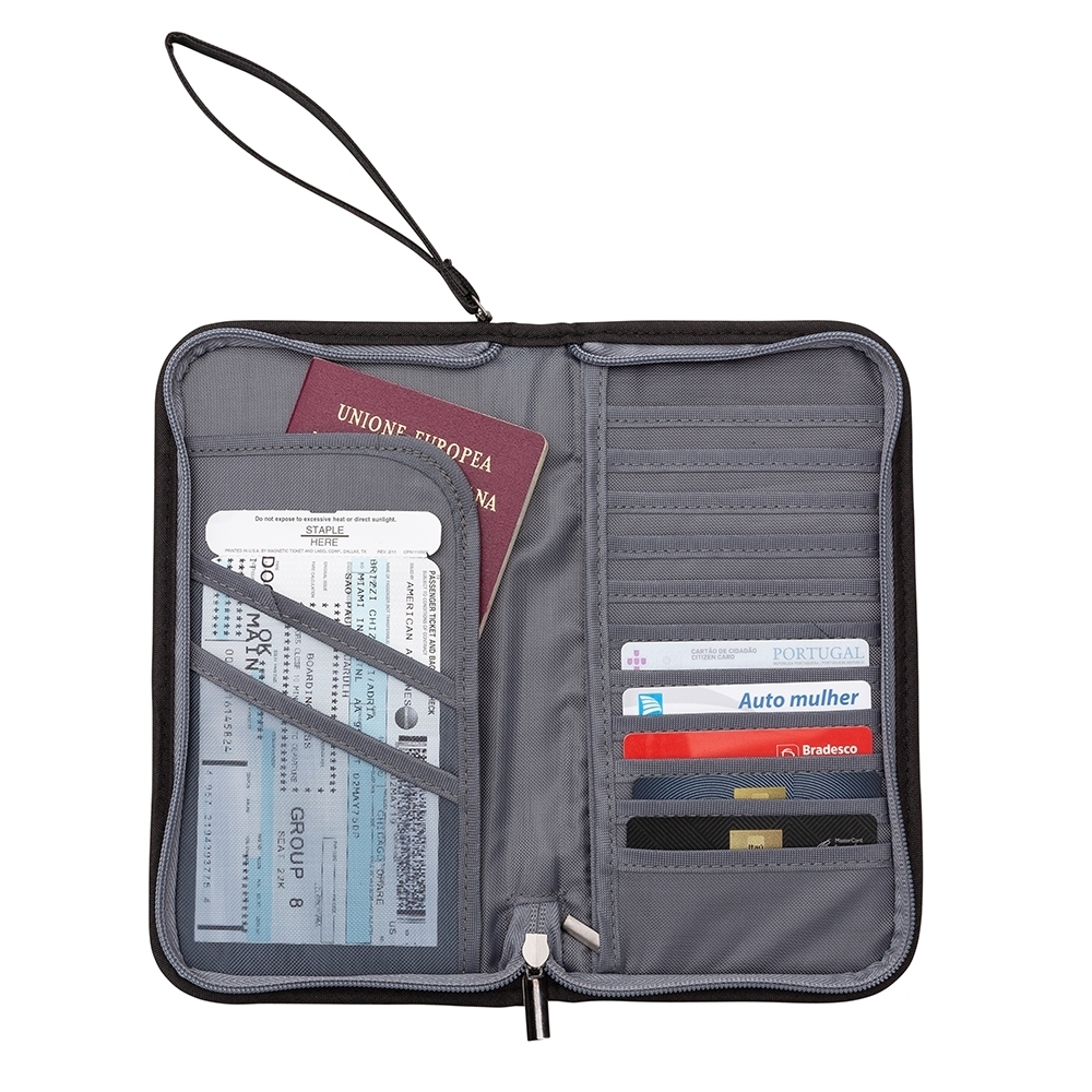 Carteira de nylon impermeável com alça de mosquetão. Com amplo espaço, possui onze divisórias para cartões e bolso no verso, compartimento com zíper e bolso aberto com duas divisórias com tela para documentos; parte externa com bolso para celular.