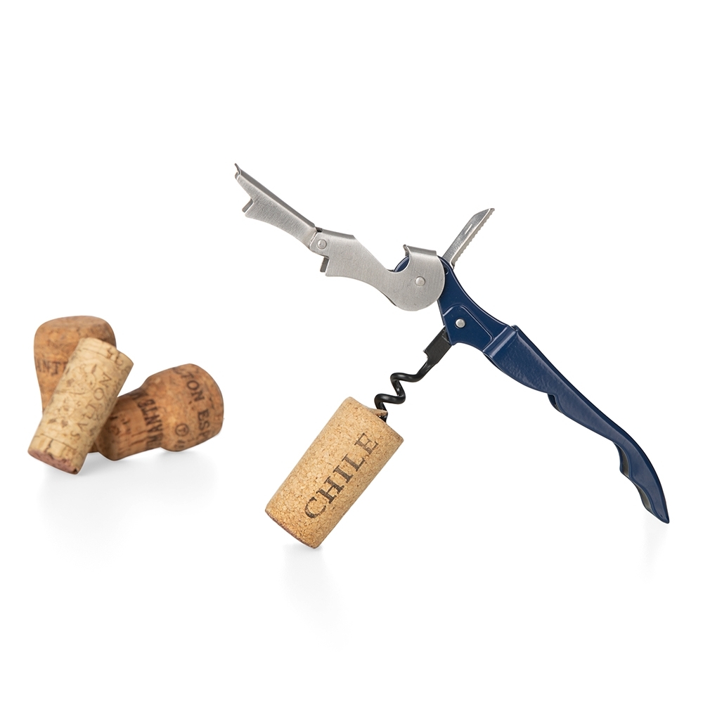 Saca rolhas metálico de 2 estágios com acabamento fosco. Contém abridor de garrafa, lâmina de corte e saca rolhas.