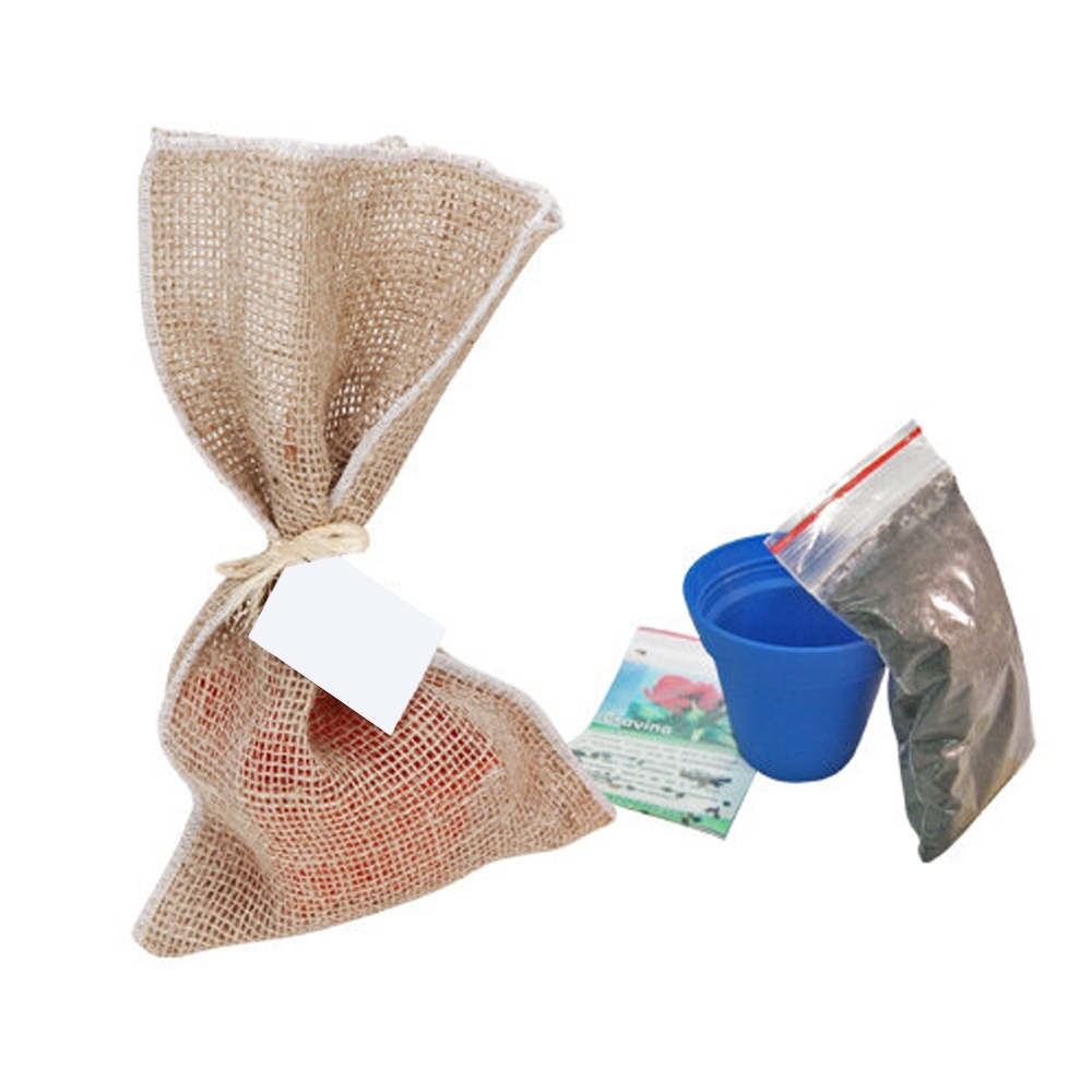 Composto do nosso Kit Cultivo (vasinho de plástico reciclado, sementes de flores, substrato de terra e pazinha ecológica) embalado em saco de juta natural, personalização no TAG em papel reciclado tamanho 4,5 x 6,5 cm, impresso com 4 cores e amarrado com fio de Rami.