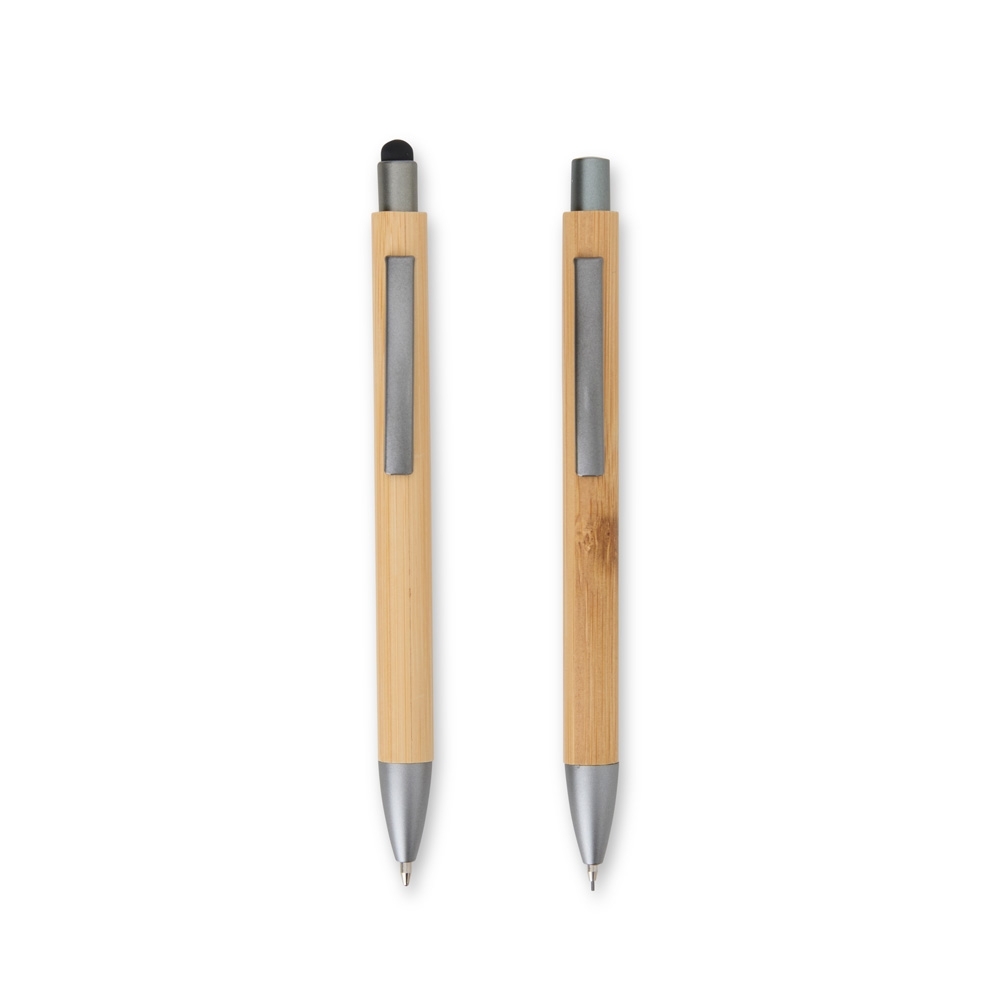 Nosso Kit Ecológico de Caneta e Lapiseira de Bambu é excelente para quem busca um toque sustentável no dia a dia. A lapiseira possui acionamento por clique, e a caneta conta com carga esferográfica azul de 1.0mm e função touch para quem precisa de toques precisos em dispositivos. Além disso, acompanha uma embalagem que imita bambu. Uma ótima escolha para presentes corporativos ou para quem ama escrever sem abrir mão da consciência ecológica!