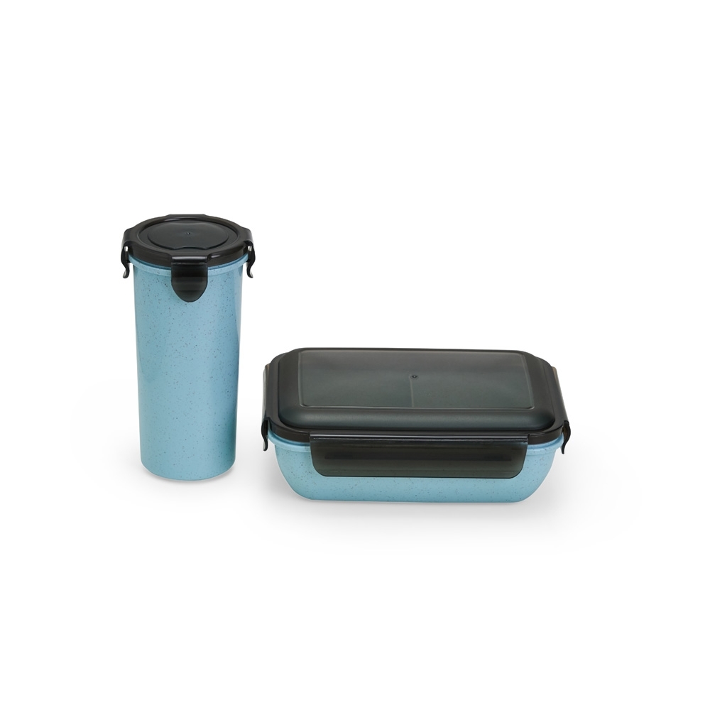 : Kit com copo salada de 500ml e marmita hermética de 1L com divisórias, garfo e faca feitos em fibra de bambu. A combinação ideal para as refeições do dia a dia. Feitos em PP atóxico e livres de BPA, são totalmente seguros para alimentos. Ambos são equipados com travas de segurança e supervedação, permitindo que leve-os para qualquer lugar sem riscos de vazamentos. O copo possui escala de medição até 500 ml e sua tampa ainda serve como porta copo, enquanto a marmita contém três divisórias internas que mantêm os sabores separados e controlam as porções, facilitando a montagem de uma dieta equilibrada.