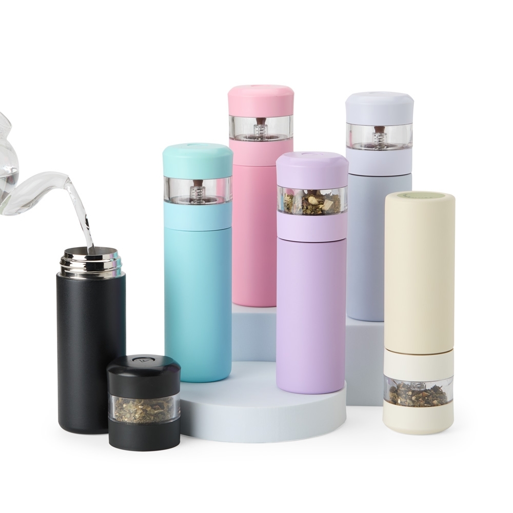 Garrafa térmica de 350ml feita em aço inoxidável 304. Possui compartimento separado com infusor integrado e botão na parte superior da tampa para acionar a liberação do líquido para o compartimento.