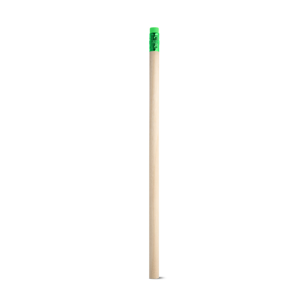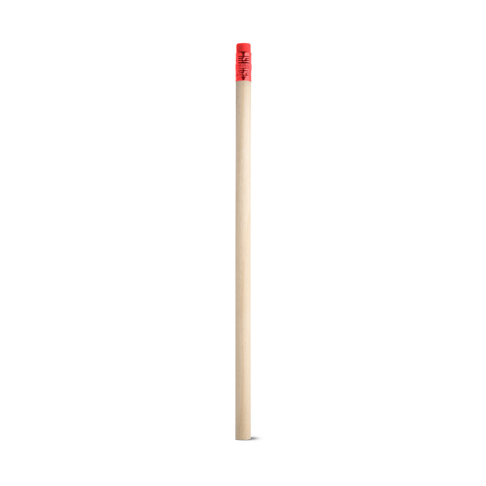 Lápis em madeira natural com borracha no topo. Grau de dureza: HB. Produto certificado de acordo com a portaria Inmetro nº423 de 8/out/2021. A cor e o resultado da impressão nos materiais naturais pode variar entre produtos. ø7 x 190 mm