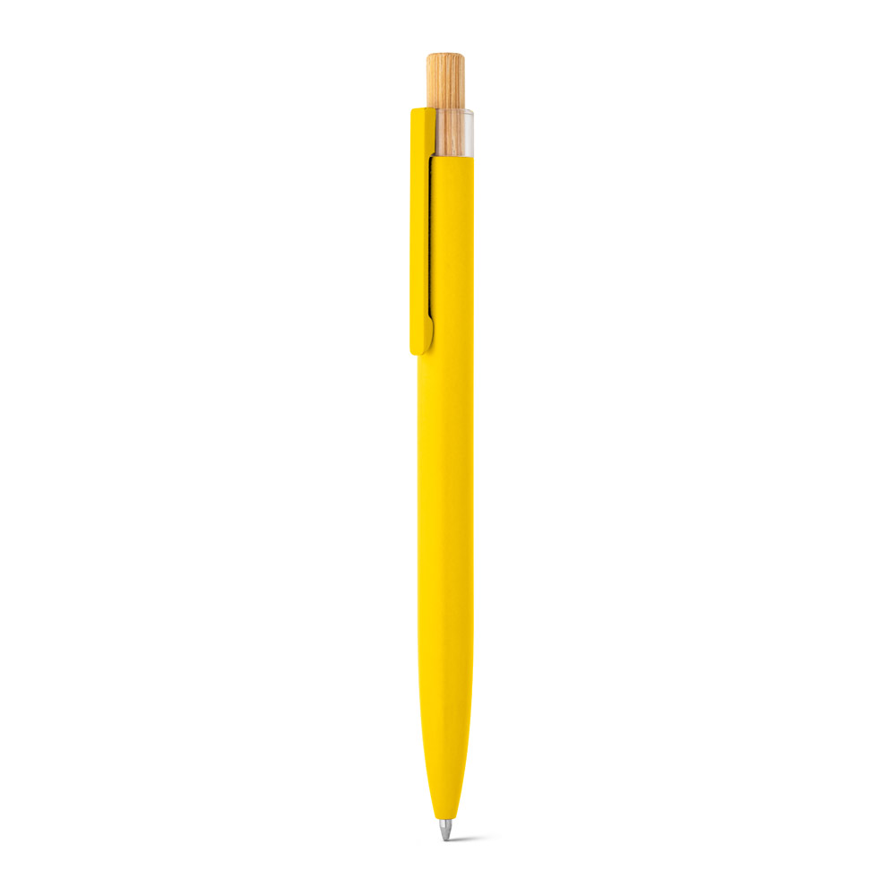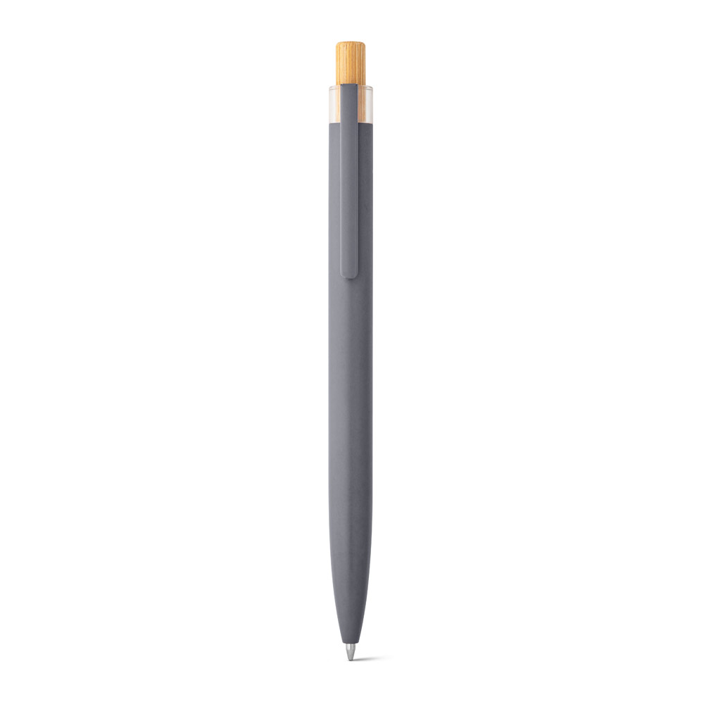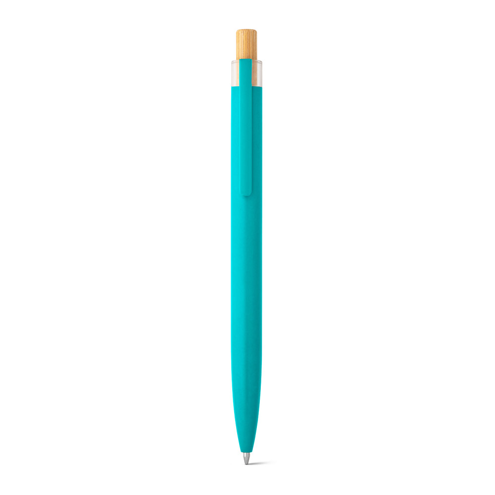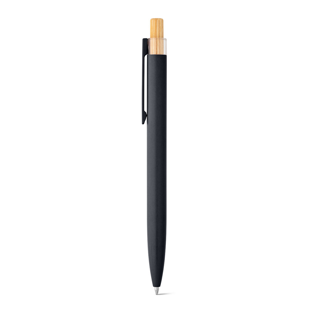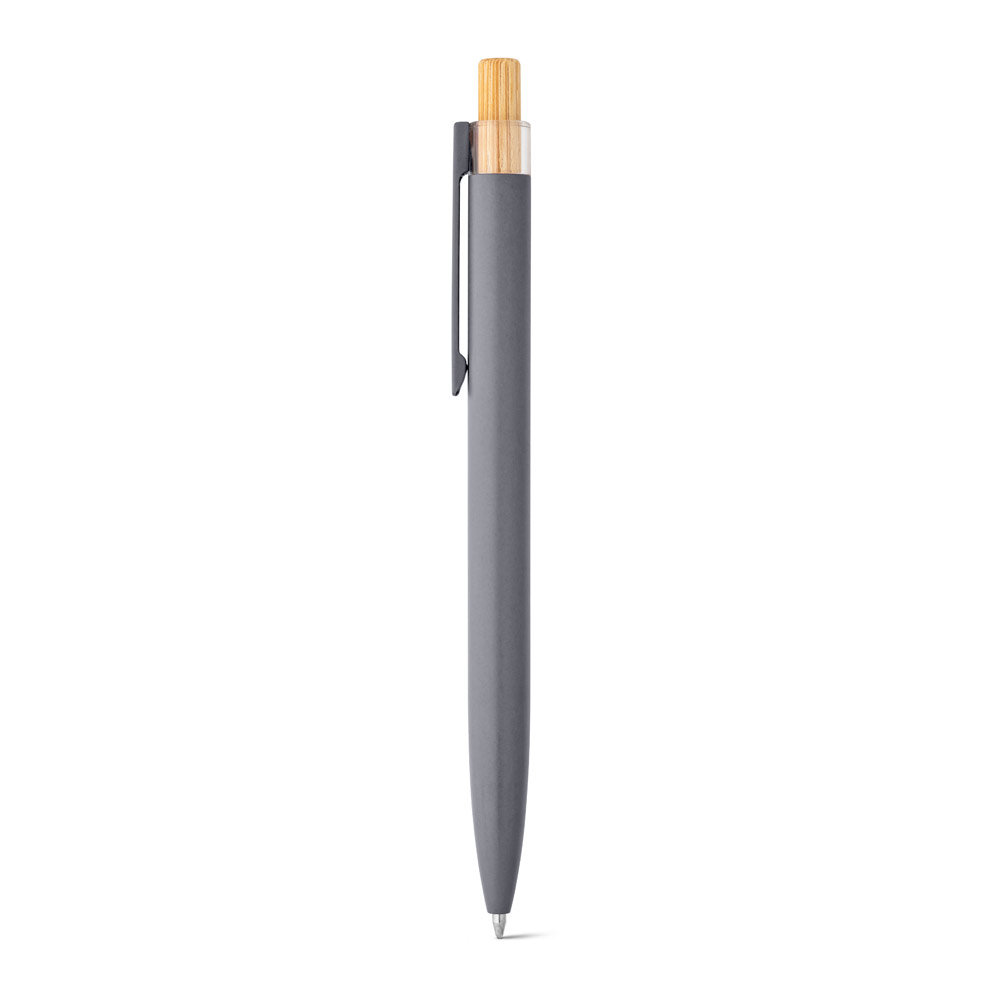 Esferográfica com corpo em alumínio 100% reciclado, topo em 100% rPET, botão em bambu e clipe de metal. Escrita em azul. A cor e o resultado da impressão nos materiais naturais pode variar entre produtos. ø10 x 140 mm