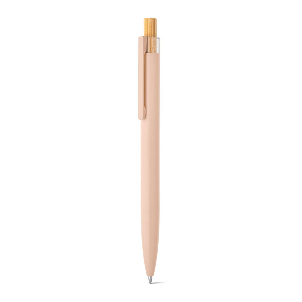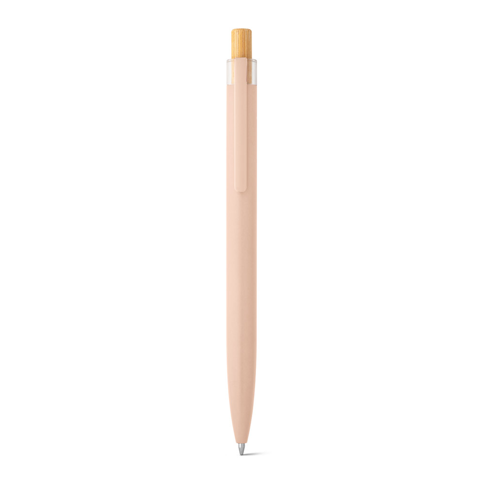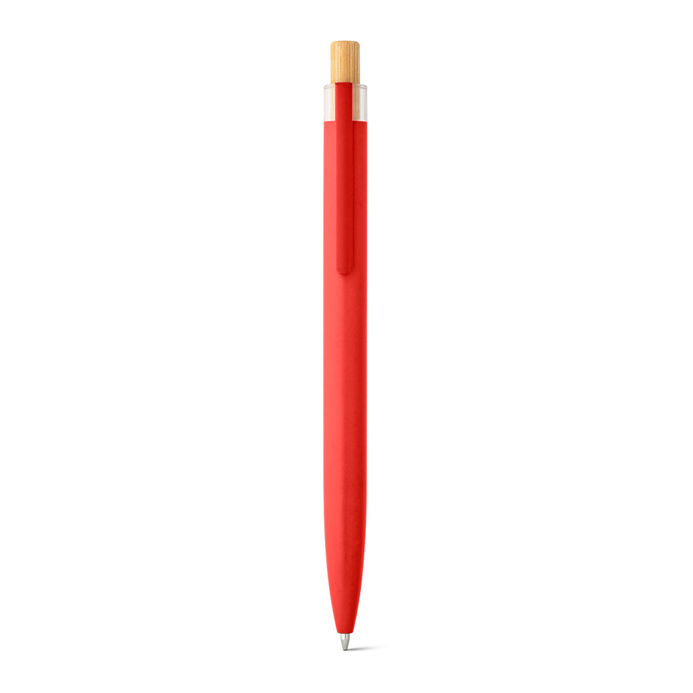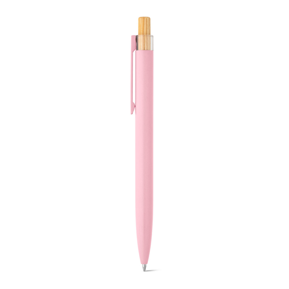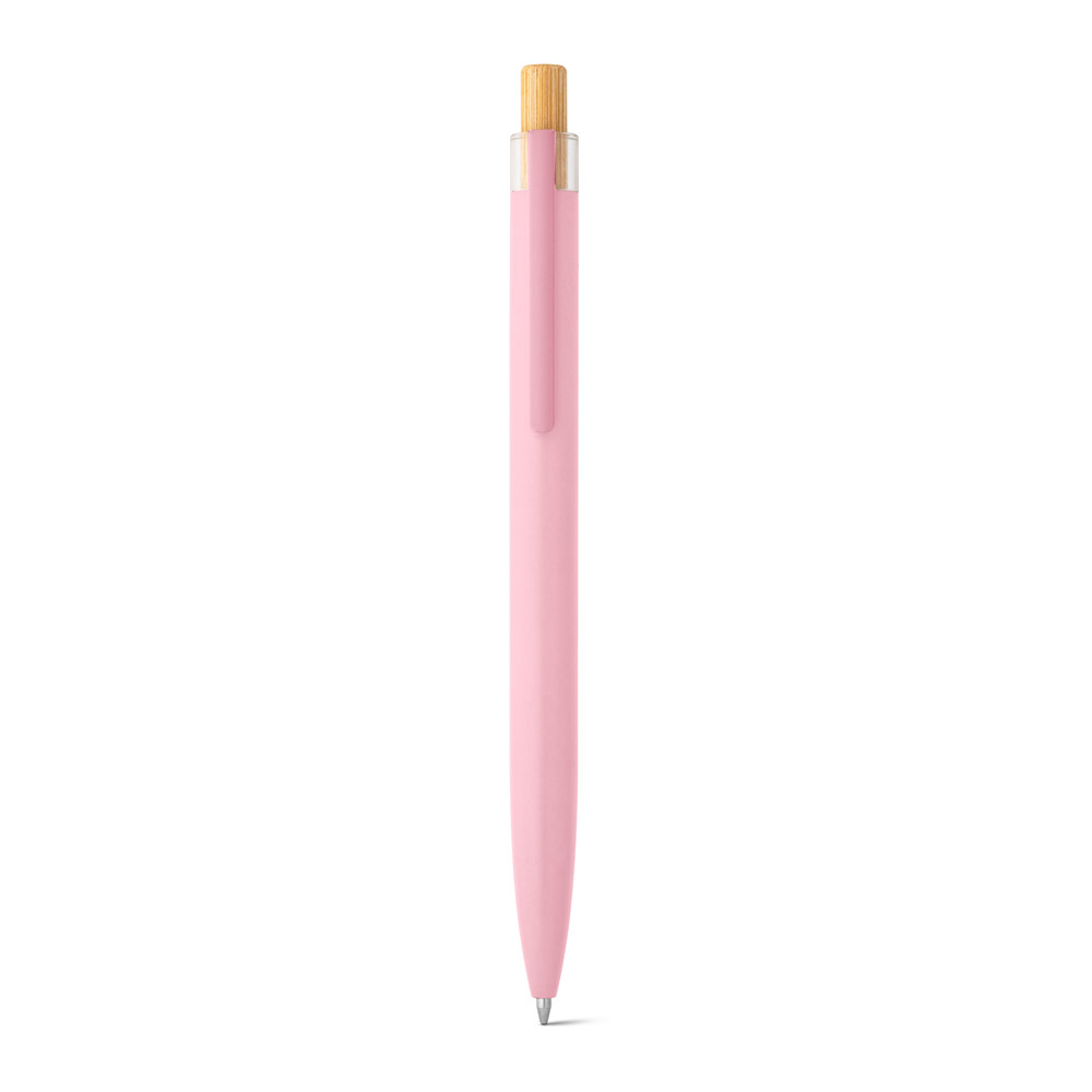 Esferográfica com corpo em alumínio 100% reciclado, topo em 100% rPET, botão em bambu e clipe de metal. Escrita em azul. A cor e o resultado da impressão nos materiais naturais pode variar entre produtos. ø10 x 140 mm