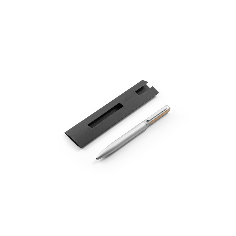 Esferográfica em alumínio 94% reciclado com detalhe em bambu no clipe. Escrita em azul. Fornecida em bolsa de oferta. A cor e o resultado da impressão nos materiais naturais pode variar entre produtos. ø12 x 140 mm | Bolsa: 40 x 155 mm