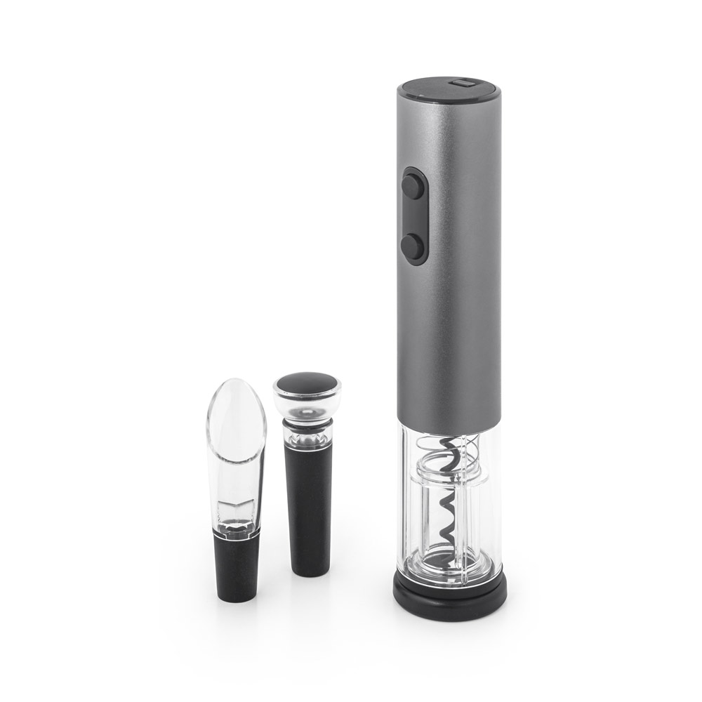 Conjunto de saca-rolhas elétrico em alumínio e acessórios: corta-cápsulas, rolha de vácuo e salva-gotas (pilhas inclusas). Fornecido em caixa presente.