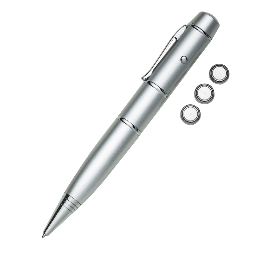 Caneta pen drive 4GB metálica com laser e esferográfica. Clip de metal e botão do laser com lacre, ao desrosquear anel abaixo do clip abre compartimento das baterias(acompanha 3 LR1130) e ao desrosquear o anel abaixo abre compartimento do pen drive. Para utilizar a esferográfica basta rotacionar a ponteira.