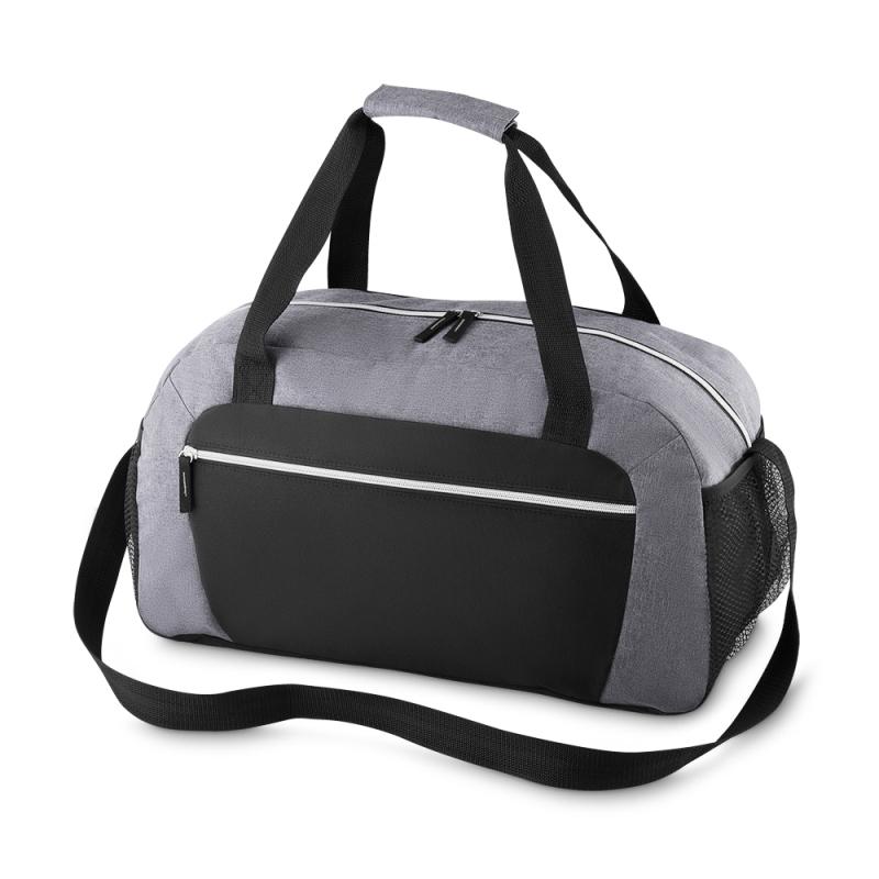 Bolsa esportiva de poliéster. Possui alça de mão com pegador cinza de velcro, alça ajustável para as costas e bolsos laterais de malha.