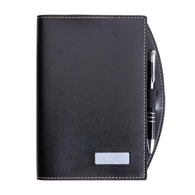 Bloco de anotações em couro sintético e suporte plástico para caneta